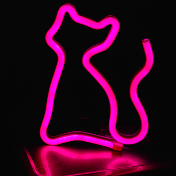 Φωτιστικό γάτα κατάλληλο για διακόσμηση εσωτερικών χώρων. Διαθέτει neon ροζ φωτισμό. Τροφοδοτείται με USB ή με 3 μπαταρίες τύπου ΑΑ (δεν περιλαμβάνονται).