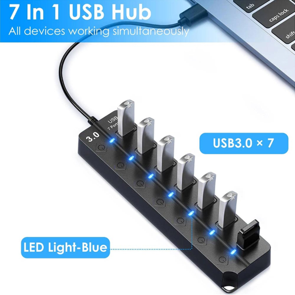 USB Hub με 7 θύρες εξόδου USB 3.0. Κατάλληλο για σύνδεση πολλαπλών συσκευών όπως εξωτερικοί δίσκοι, πληκτρολόγια, ποντίκια, φορτιστές καθώς και άλλες περιφερειακές συσκευές υπολογιστών. Ιδανικό για χώρους εργασίας, gaming αλλά και για ταξίδια, camping και άλλα μέρη που χρειάζονται διάφορες επαναφορτιζόμενες συσκευές. Διαθέτει On/Off διακόπτες για κάθε θύρα ξεχωριστά. Συνδέεται με USB ενσωματωμένο καλώδιο, ο αντάπτορας τροφοδοσίας δεν περιλαμβάνεται. Είναι plug-and-play, δεν χρειάζεται κάποια περαιτέρω εγκατάσταση.